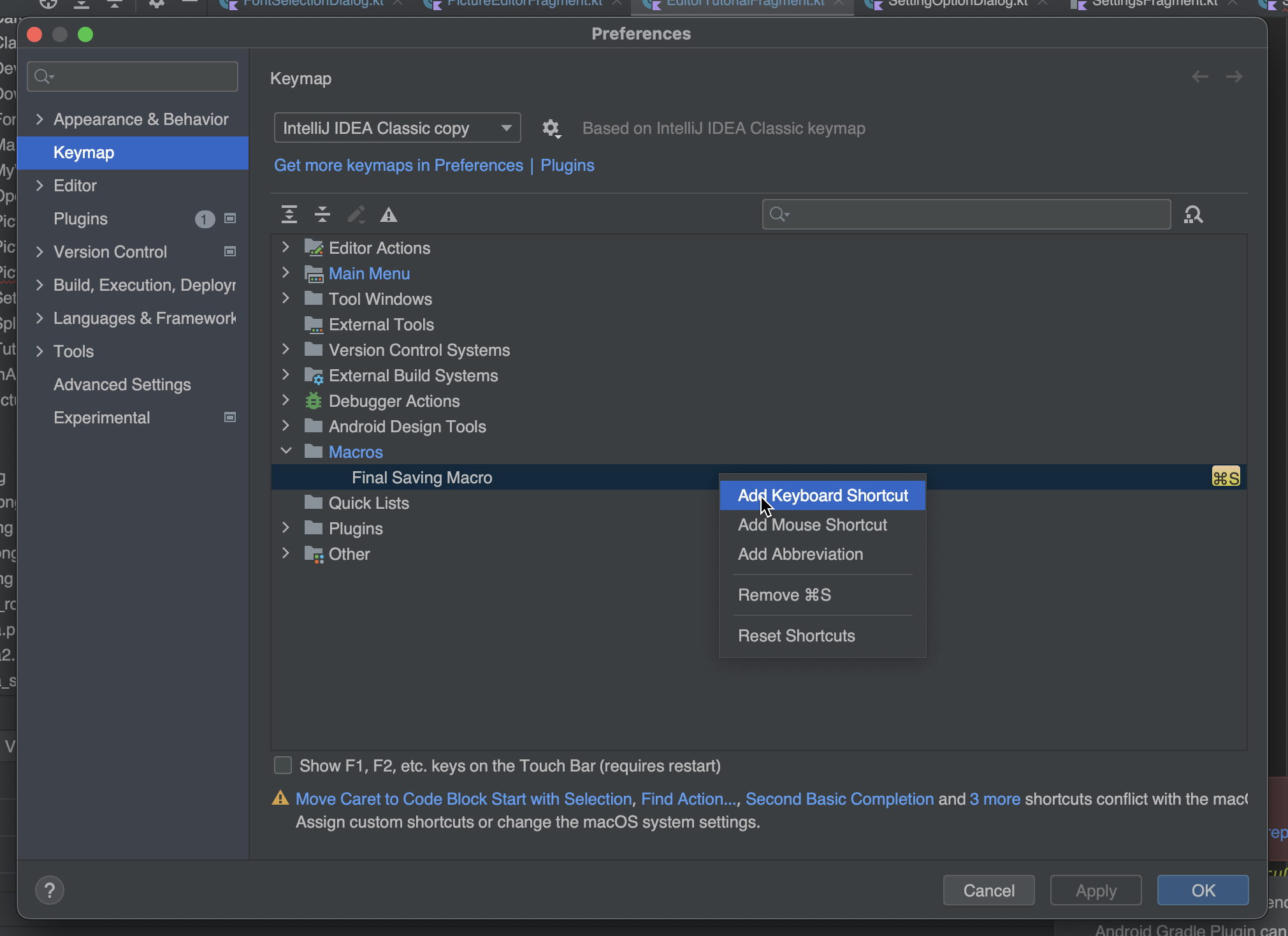 생성한 Final Saving Macro 에 (⌘+S) 라는 숏컷을 입력해야한다. 아까 그 Keymap 설정으로 돌아가서 Macro 파일 하위에 생성한 매크로를 찾아 “Add Keyboard Shortcut” 을 선택하고 (⌘+S)을 지정한다.