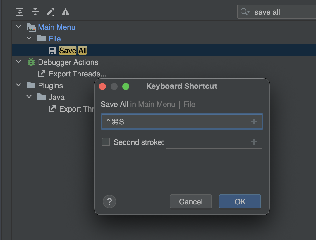 기존에 ctrl+s(mac 의 경우 ⌘+s) 에 저장되어있는 것은 “Save All” 이다. 우리는 해당 단축키에 새롭게 지정하 macro 를 지정하려하기 때문에 기존의 Save All 을 다른 단축키로 저장 해주어야한다.